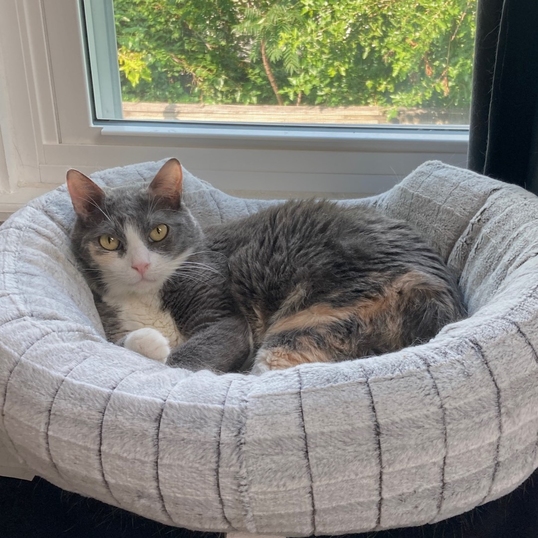 She loves running, exploring, and chasing wand toys! She doesn’t have time to sit still very often, but you might get some “drive by” nuzzles or butt elevators from her. (If you’re really lucky, she might sneeze on you!) She doesn’t get feisty with humans, but she can still be a diva in her own way. Mostly, it’s entertaining to watch her hangout nearby and “cat”!